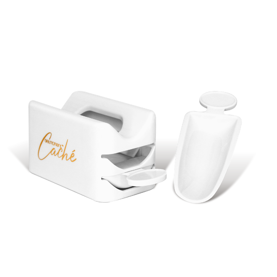 Gelmoment caché, a convenient recycling system that reduces product waste when creating beautiful nail art. Caché increases the ease of cleaning up with its two-tray design that collects and reuses excess powders and glitter effectively.